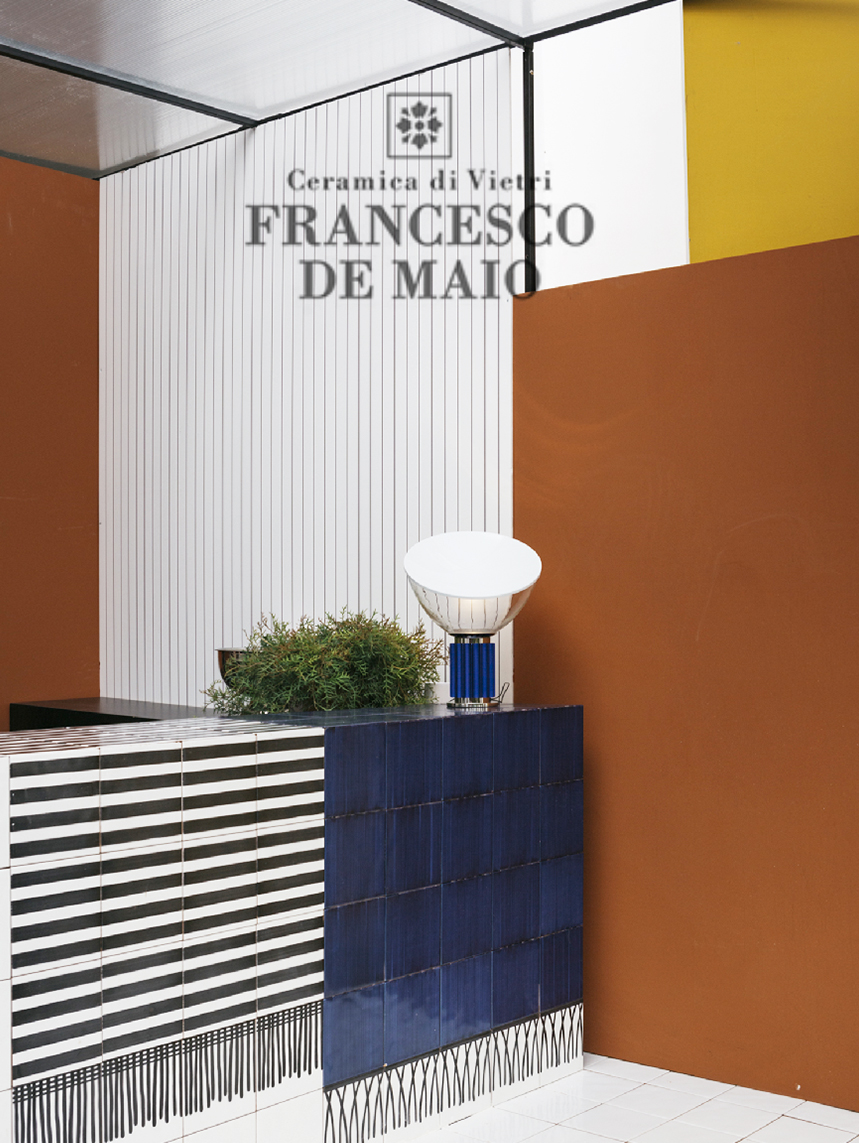 Giuliano Andrea dell'Uva progetta su base in cotto decorato e smaltato una serie di majoliche che richiamano colori mediterranei attraverso decorazioni geometriche.